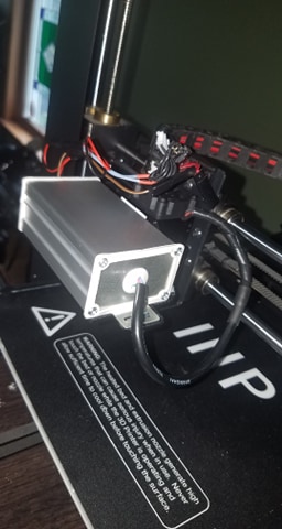 All assembled, I could successfully power the laser by turning on the extruder and toggle the laser on or off by enabling or disabling fan 1. Now for getting it to print something….