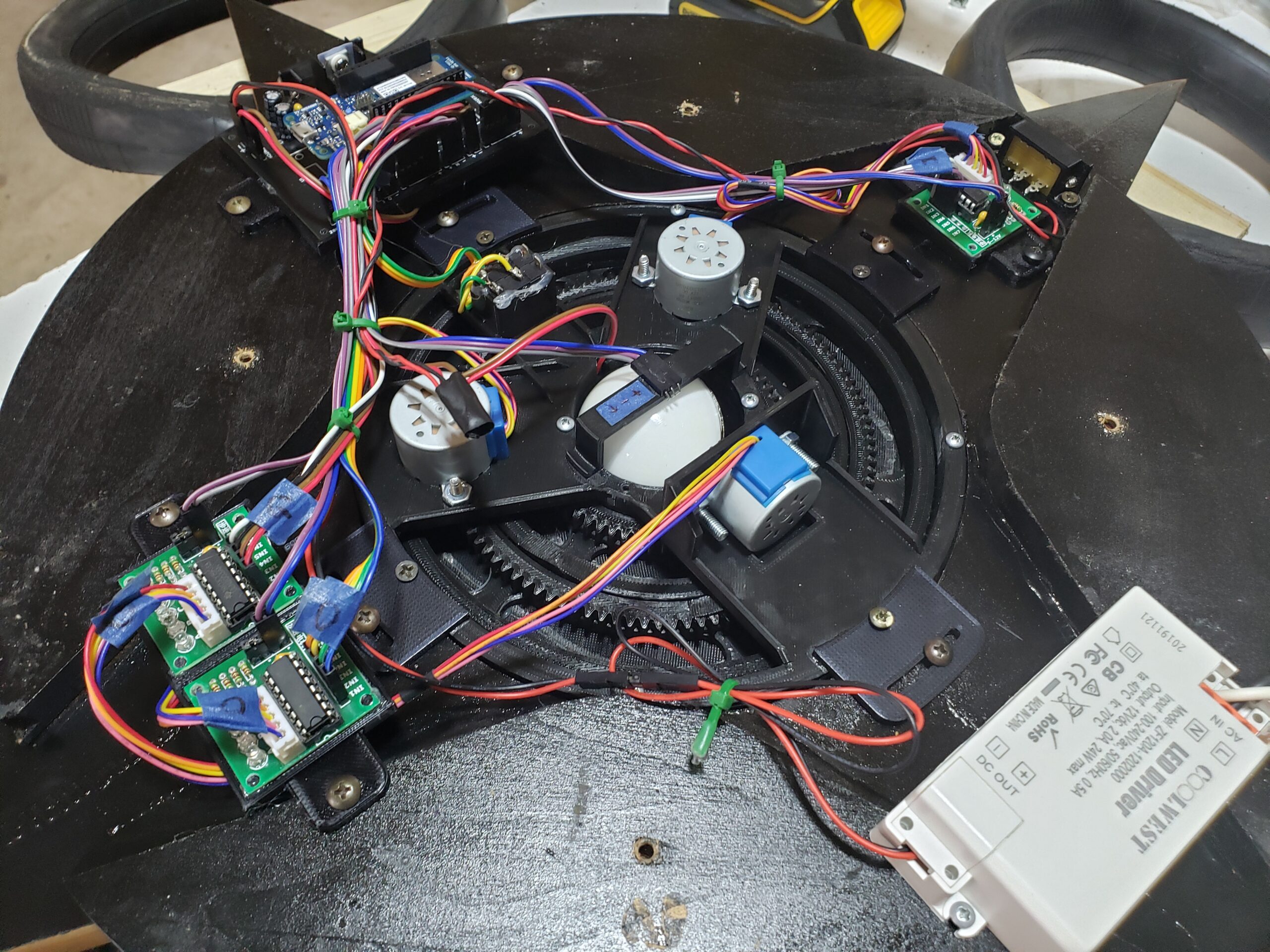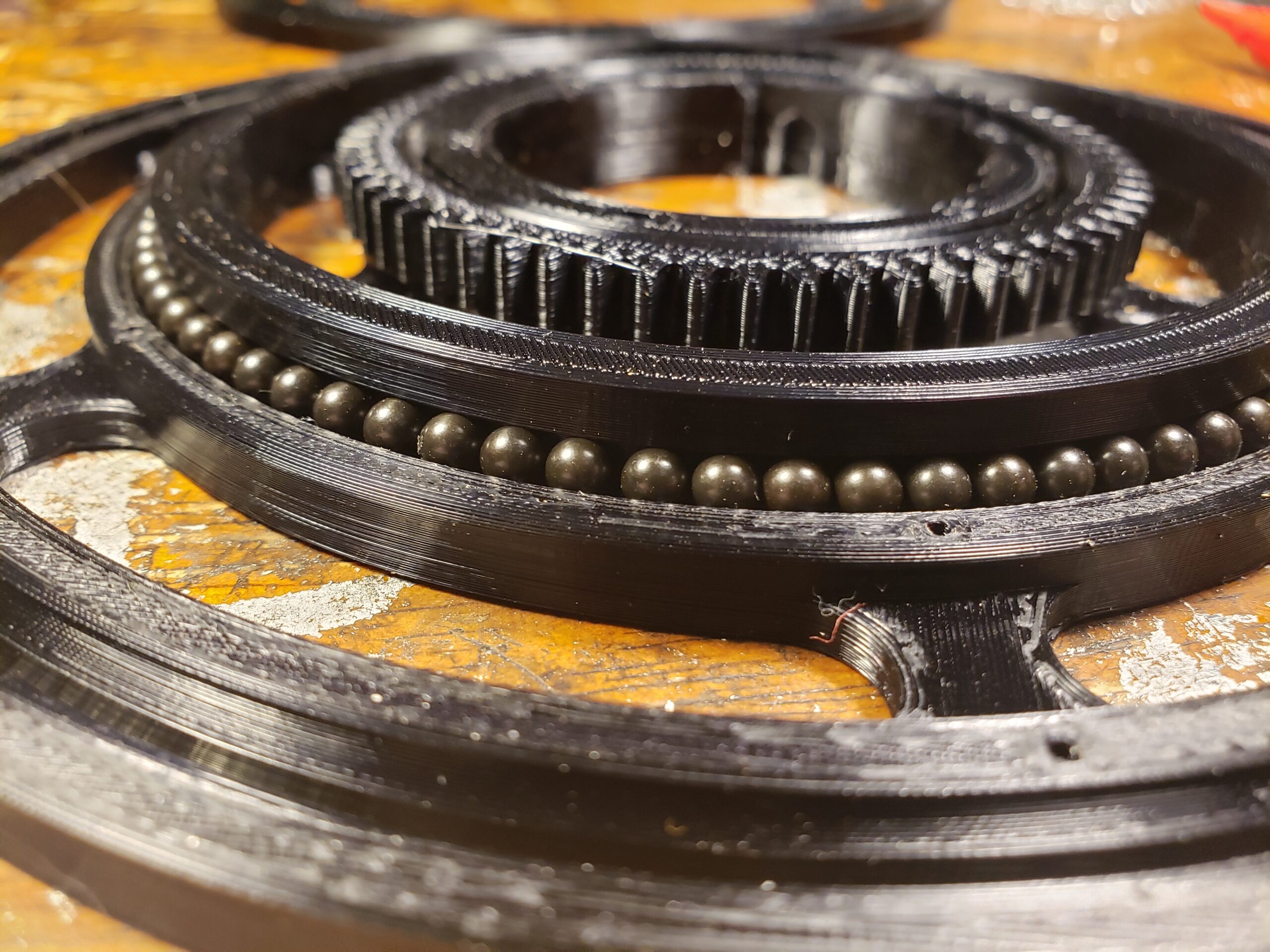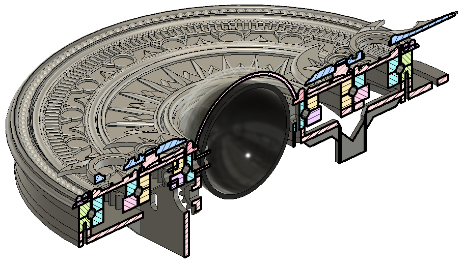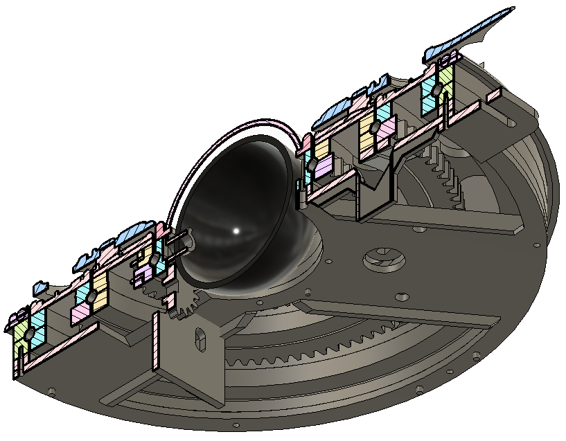 The myriad of mechanical components were painstakingly designed in CAD and principally consists of a series of interlocking rings that are each comprised of several components including a face, top retainer, bottom retainer and gearing.  These gearing rings are all assembled in place separated with ball bearings to form integrally interlocking geared bearing rings.
