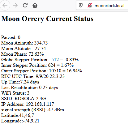 Meanwhile the device broadcasts a private website on the local network that provides detailed information about the status of the clock, capability to perform various debugging and maintenance operations and, perhaps most importantly, the ability to update the latitude and longitude of where the clock resides.
