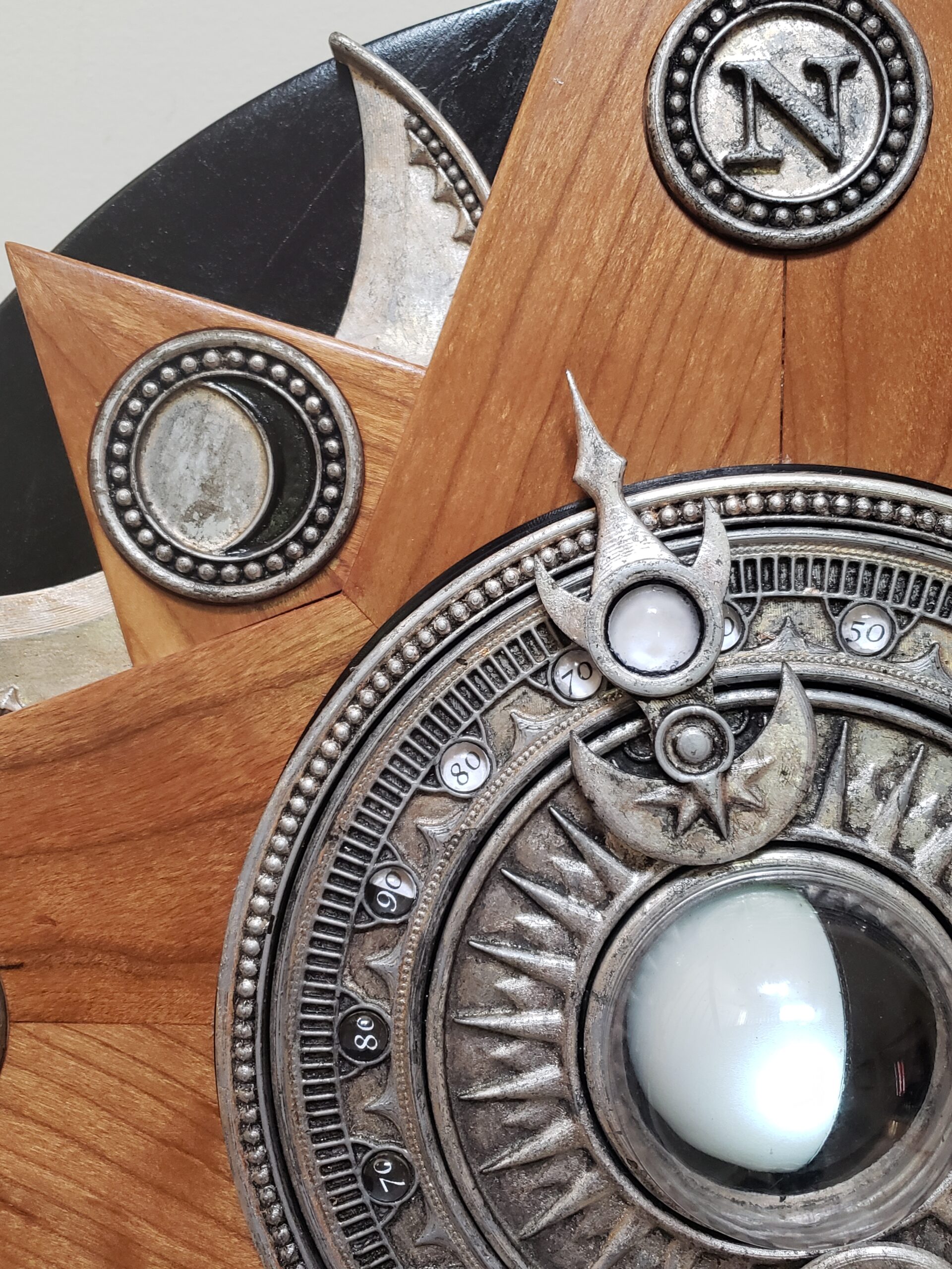 This device, measuring approximately 2 feet from tip to tip, tracks the cardinal direction, elevation and phase of the moon in real time based on your location on the planet.  The phase of the moon is represented by an illuminated globe in the center, the cardinal direction towards the moon by the arrow hand, and the angle of elevation of the moon above your true seasonal horizon by the number within the reticle on the back side of the arrow hand.  The numbers are shaded to indicate whether the moon is above or below the horizon and each number is magnified under a glass cabochon.