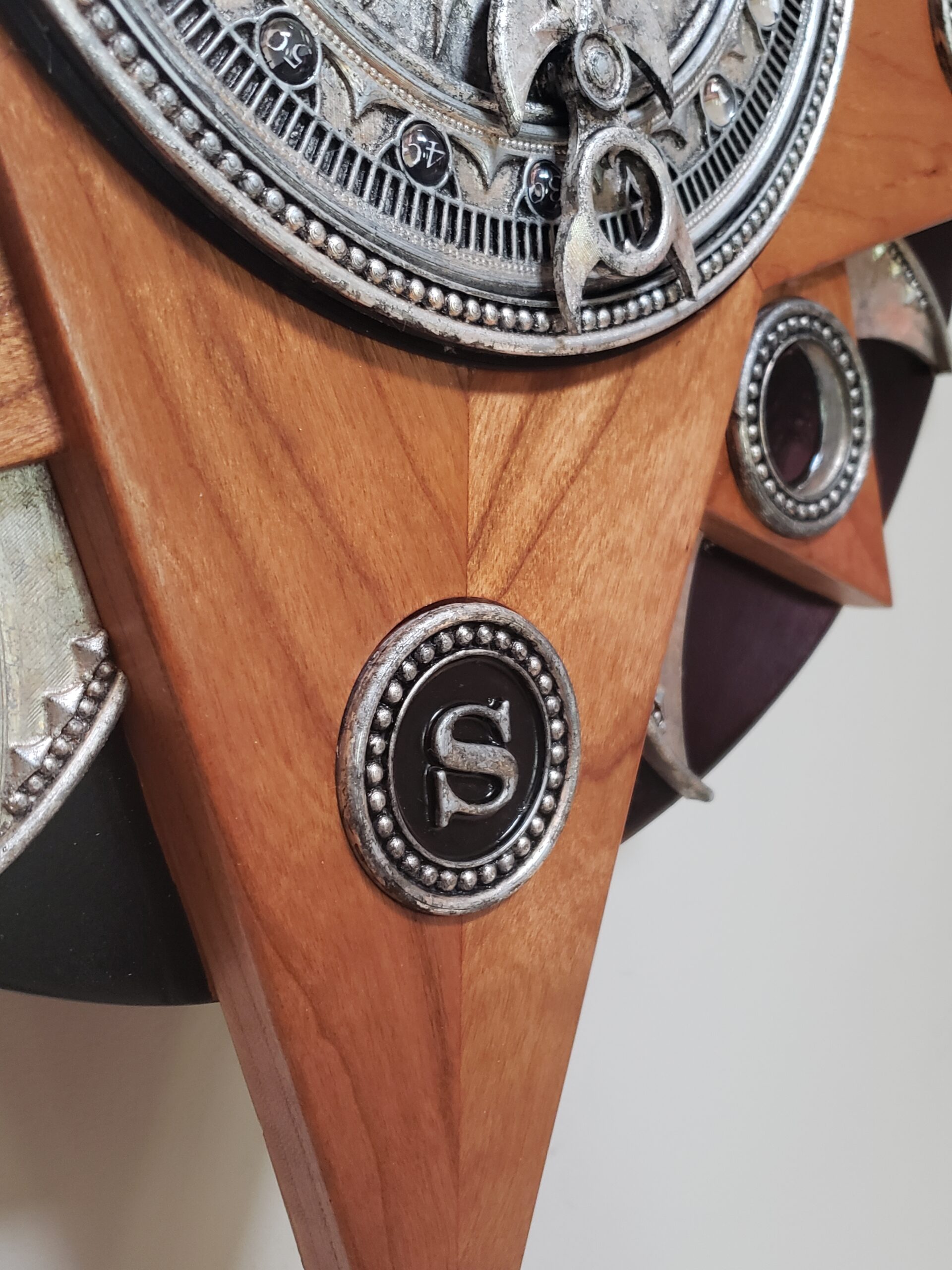 The face of the clock is constructed from maple and finished with Tung oil, and the black backer is lacquer.  The various bezels, flourishes and medallions are 3d printed and carefully gilded in pure sterling silver, the most lunar of metals; I absolutely love how the patina is evolving as the silver ages.  The medallions are shaded with black enamel reflecting the lunar cycle about the frame.  The bordering crescents penetrated by a triangle is an ancient lunar symbol as are the opposed crescents enclosing a round moon found within the arrow faces.